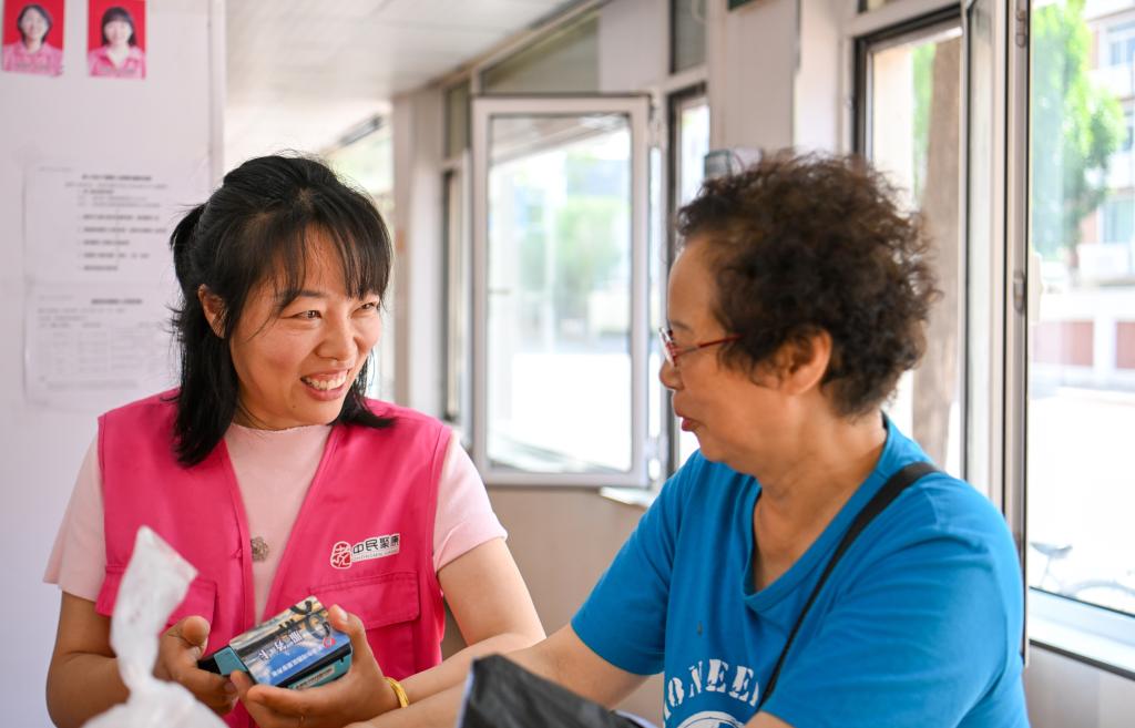 在天津市河西区宾西楼居家养老服务中心,刘缓缓(左)为老人办理业务时与老人聊家常。新华社记者 孙凡越 摄