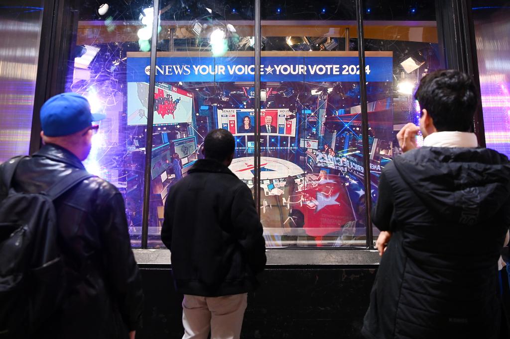 2024年11月5日,人们在美国纽约时报广场观看实时出口民调。新华社记者李睿摄