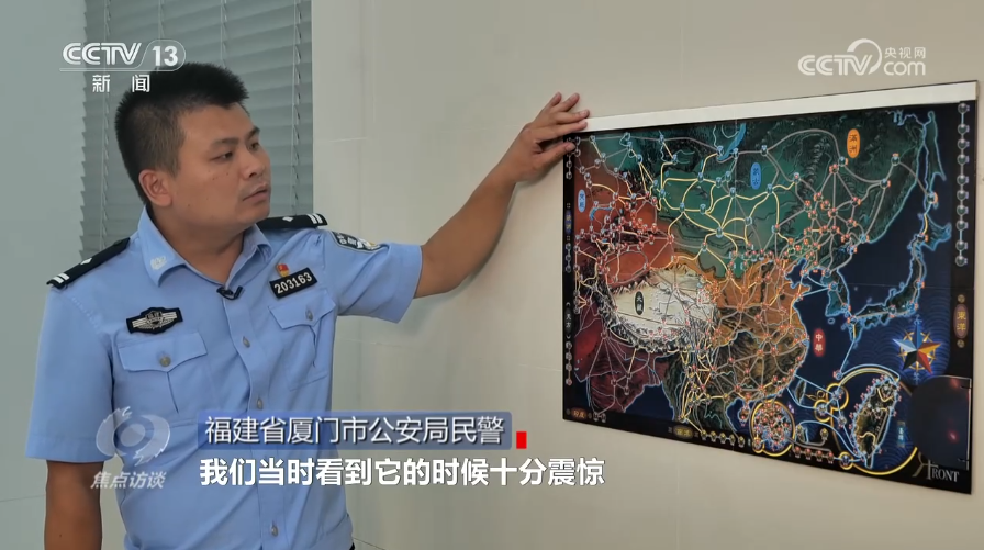 福建省厦门市公安局民警:“这款桌游我们看到的时候十分震惊,它把整个中华大地,长城以外标注为‘蒙古’,把新疆及西北地区标注为‘突厥’,把西南地区标注为‘大藏’,山海关以外称为‘满洲’。它不仅把中华大地蓄意割裂,而且演绎了各种境外分裂势力围剿‘红军’,比如‘8月15日杀共匪’。类似这样的桌游,多数都是(台湾)青少年在玩,极大扭曲青少年的思想认知,体现了极端的分裂思想。”