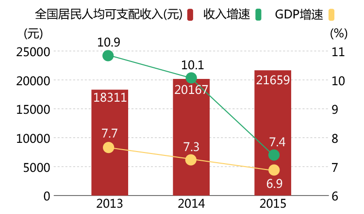 报告指出,2015年全国居民人均可支配收入实际增长7.4%,快于经济增速。去年末居民储蓄存款余额增长8.5%,新增4万多亿元。