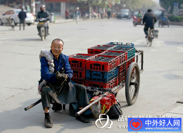 毕竟81岁的老人了,这么重的体力活,已经不太适合于他了。累了,他就在路边歇一会儿,然后继续赶路……