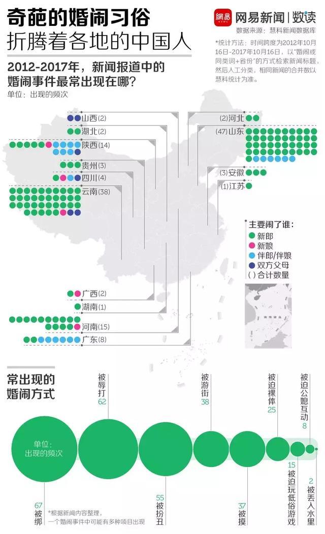 去年网易新闻曾用大数据,做出了一张“奇葩婚闹地图”——