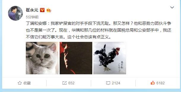 6月21日崔永元再发微博,称华姨和那几位的材料就在国税总局和公安部手中,我还不信它们能万事大吉。这个社会总该有点正义。