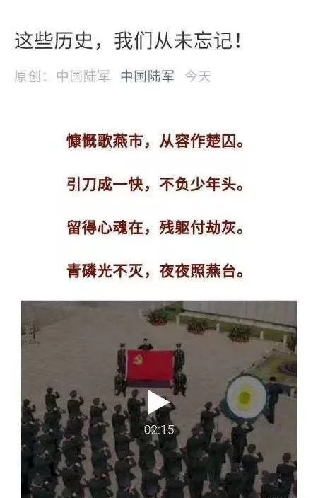 今日上午有网友反映,中国人民解放军新闻传播中心旗下中国陆军新闻信息的微信发布平台“中国陆军”的一篇新闻推送中,竟然错误的引用了在抗日战争期间投靠日本,沦为大汉奸的汪精卫所著的一首诗。