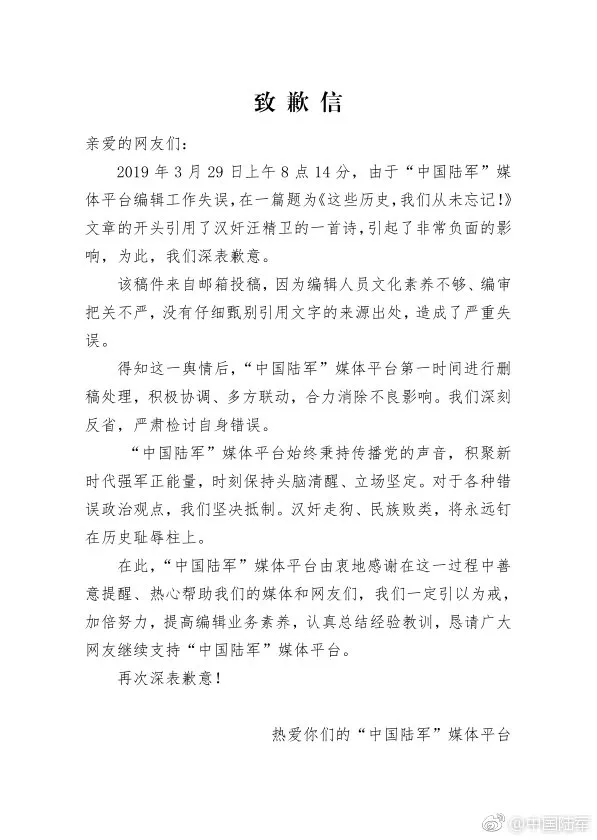 在信中“中国陆军”表示,该稿件来自邮箱投稿,因为编辑人员文化素养不够、编审把关不严,没有仔细甄别引用文字的来源出处,造成了严重失误,引起了非常负面的影响,为此深表歉意。