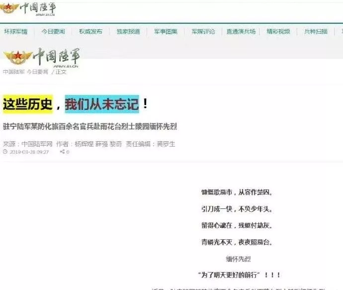 这篇名为《这些历史,我们从未忘记》的文章原本想要报道的是驻宁陆军某防化旅百余名官兵赴雨花台烈士陵园缅怀先烈的新闻,但这篇文章却引用了汉奸汪精卫所著的《被逮口占》一诗。