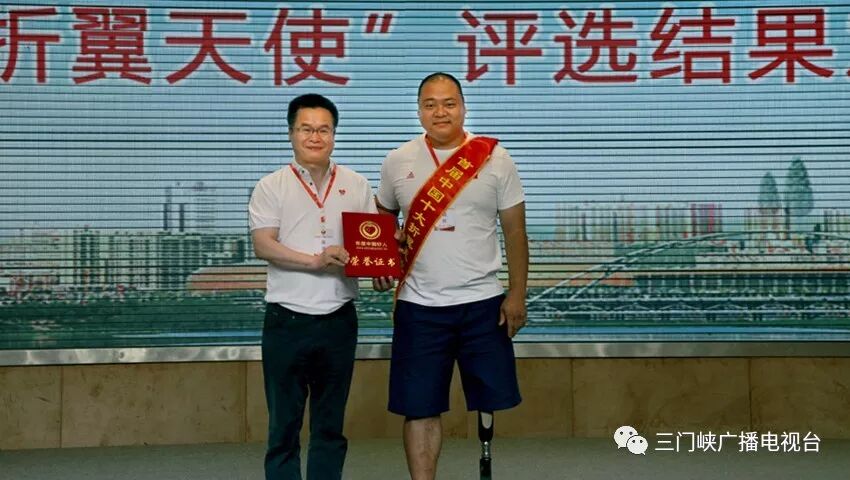 首届中国“十大折翼天使”获奖者代表庞宝龙上台领奖。
