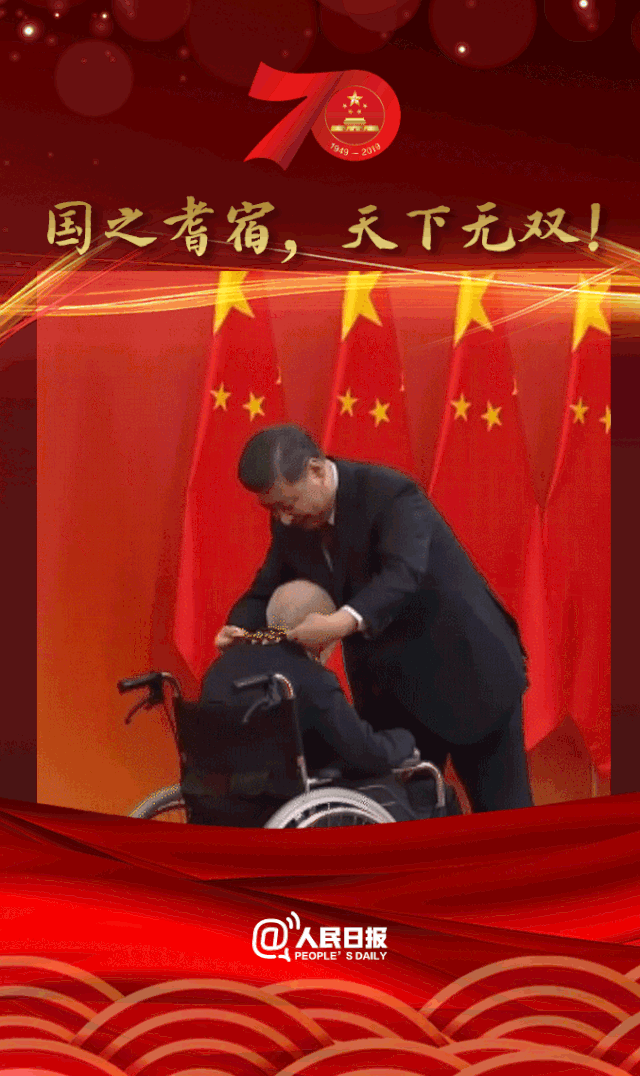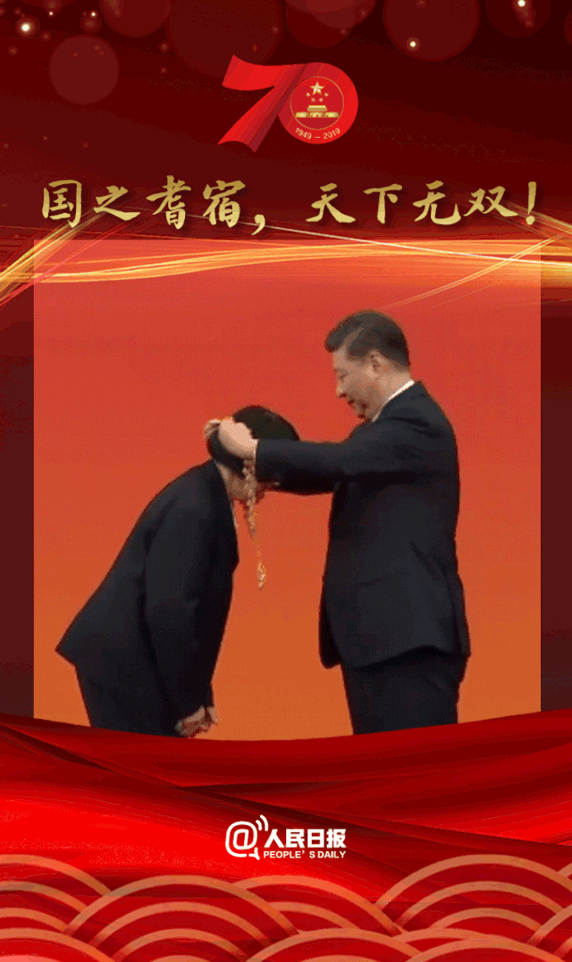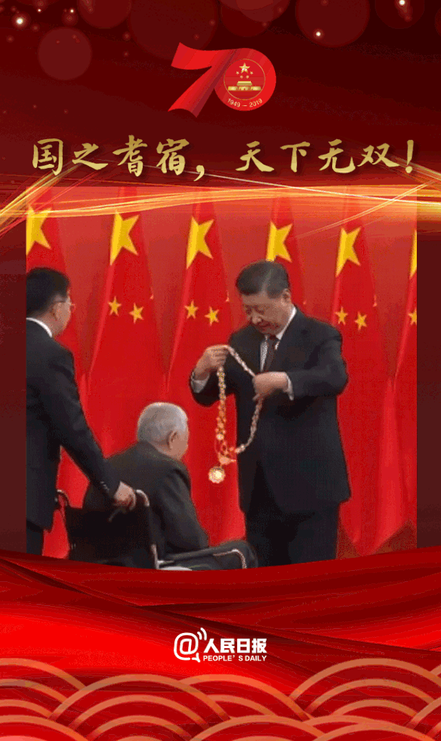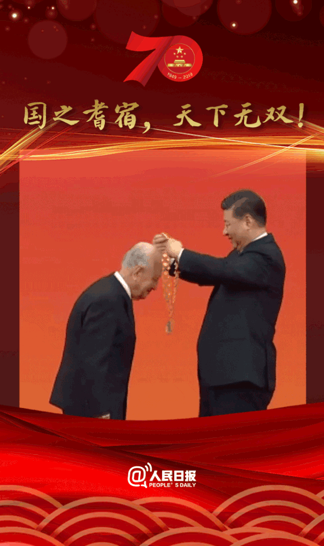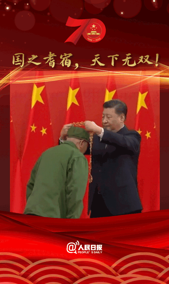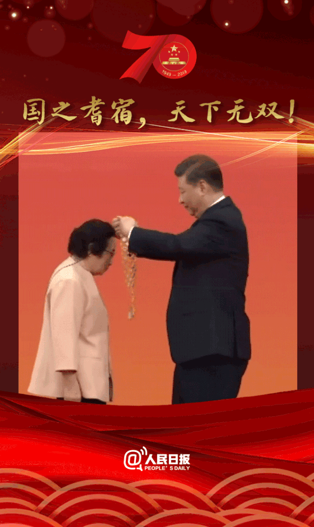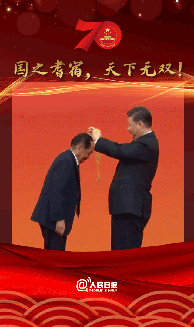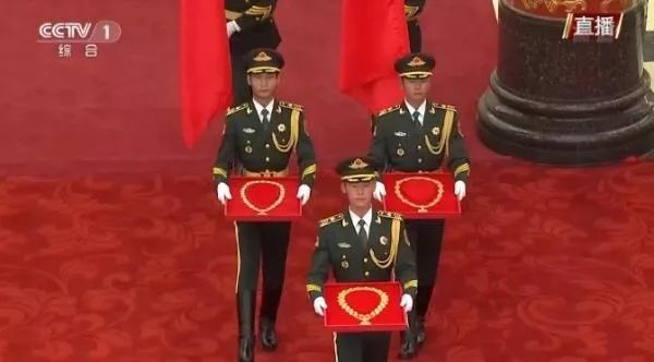 在雄壮激昂的《向祖国致敬》乐曲声中,习近平为国家勋章和国家荣誉称号获得者颁授勋章奖章。全场响起热烈掌声。