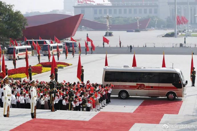 29日上午,国家勋章和国家荣誉称号获得者乘坐礼宾车从住地出发,在国宾护卫队的护卫下,前往人民大会堂。