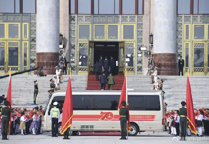 人民大会堂东门外,高擎红旗的礼兵分列道路两侧,肩枪礼兵在台阶上庄严伫立,青少年热情欢呼致意。