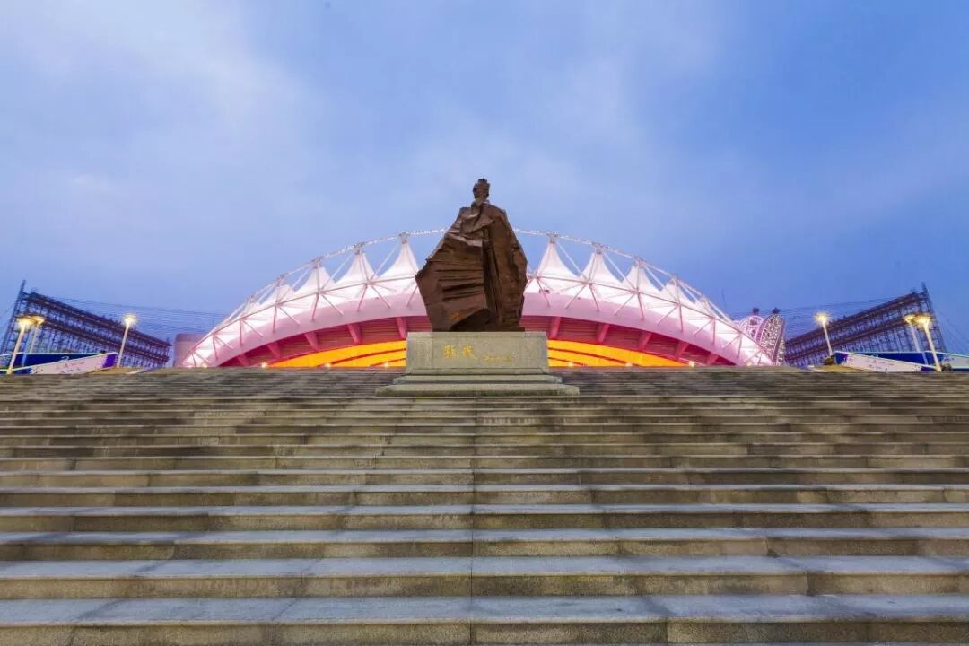 雕塑《孙武》像矗立于主体育馆前广场的台阶之上,层层叠叠拾级而上的百余级台阶,似是千军万马在奔腾,似是人类由古至今不断发展的历史路径与文化逻辑,这与巨大的圆形体育场巧妙的构成了忧乐圆融的文化景观。