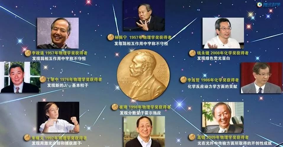 杨振宁、李政道、丁肇中、李远哲、朱棣文、崔琦、钱永健、高琨;