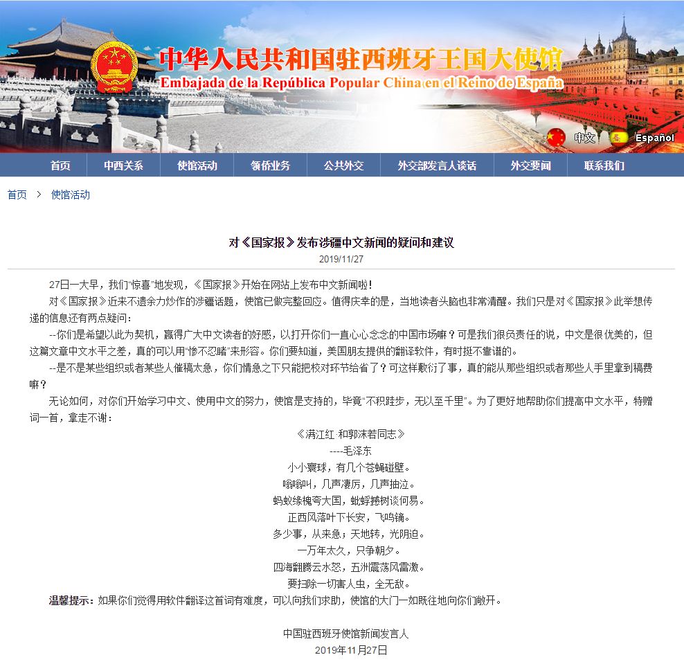 本文转载自北京日报客户端,原文首发于2019年11月29日,标题为《西班牙媒体炒作涉疆新闻,我使馆回敬一首毛主席诗词》。