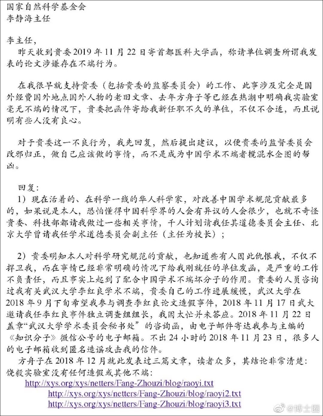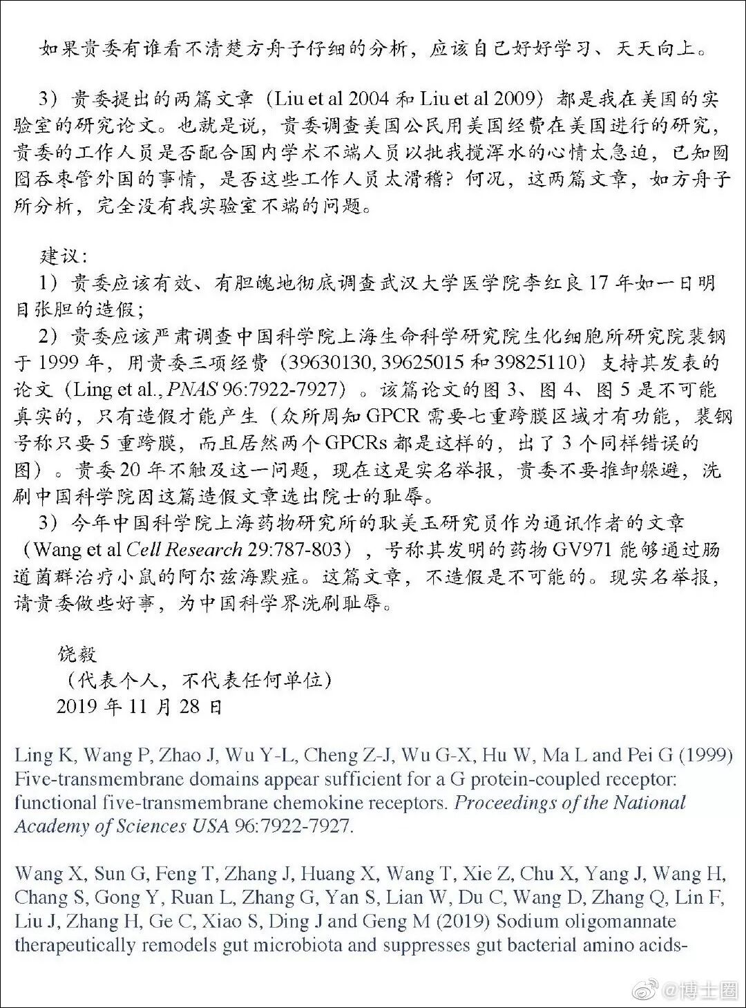 在这封实名举报信中,饶毅向国家自然科学基金委实名举报,武汉大学医学院李红良多年持续学术造假,而中国科学院上海生命科学研究院生化细胞所研究员裴钢1999年发表的论文中,3张图不真实,存在造假嫌疑。此外,饶毅还在举报信中提到,今年中国科学院上海药物研究所耿美玉研究员作为通讯作者,发表的宣称可治疗小鼠阿尔茨海默症论文存在造假情况。