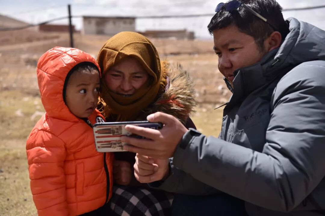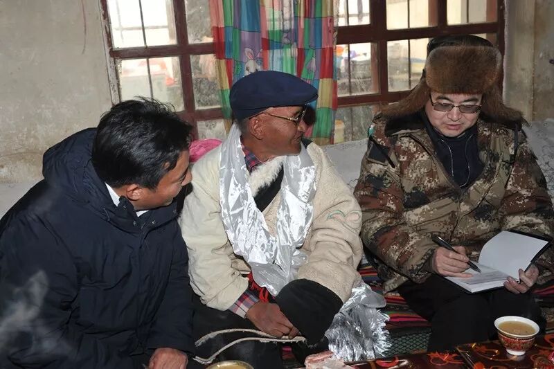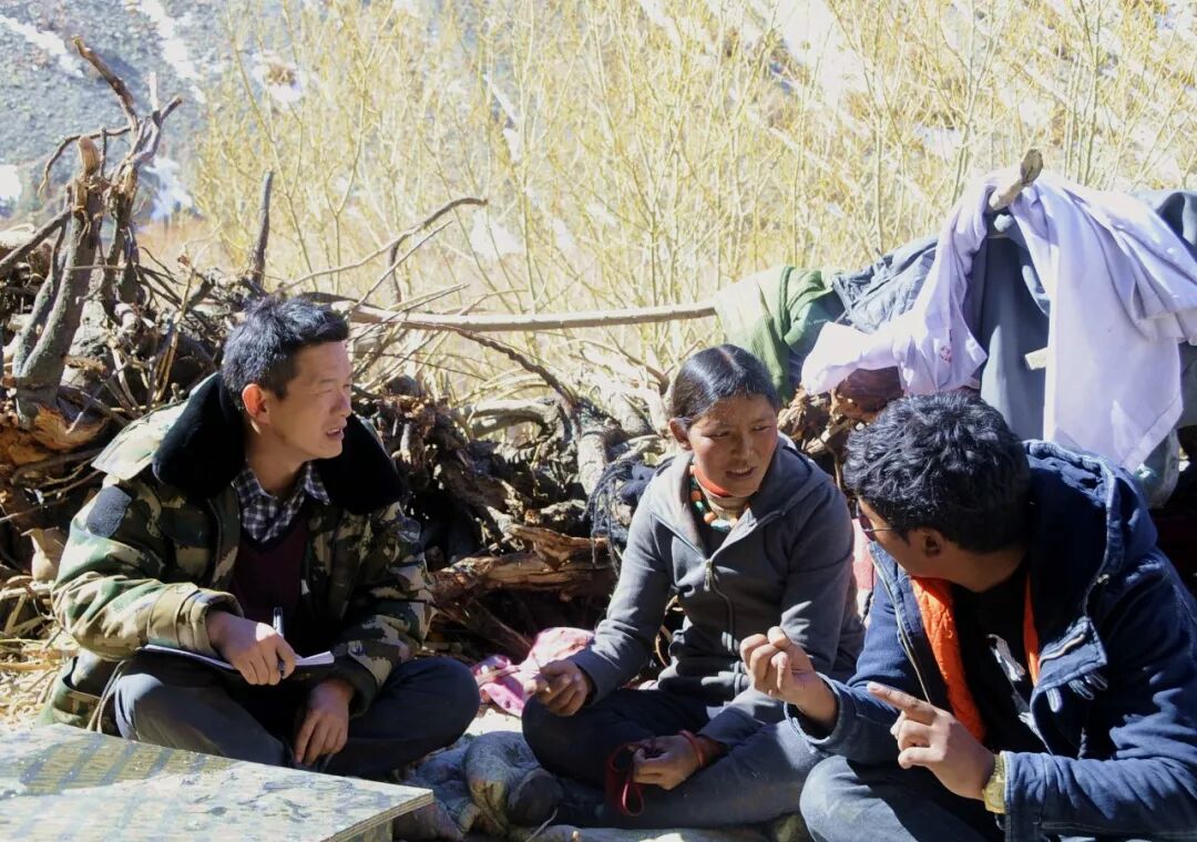 2019年4月9日,西藏分社记者陈尚才(左一)在西藏阿里地区札达县楚鲁松杰乡挂职期间,在巴卡村巴角组采访。(洛桑云旦 摄)