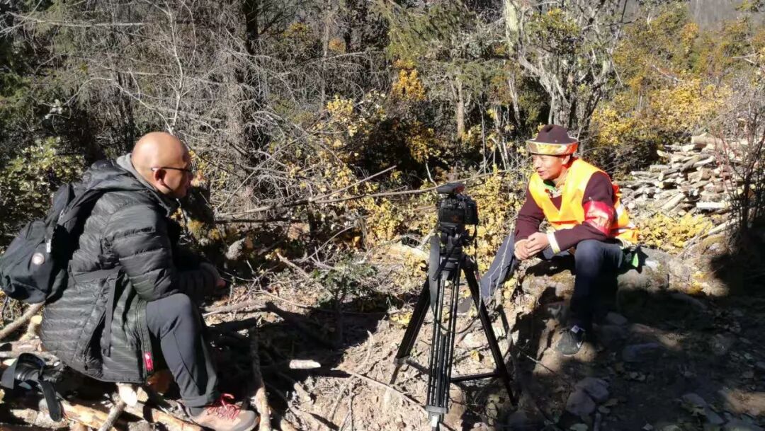 2017年8月17日,西藏分社记者洛登(左)在拍摄西藏环保主题视频时,与护林员一起走进藏东密林深处,体验式采访护林员一天的工作。(新华社记者 坚赞 摄)