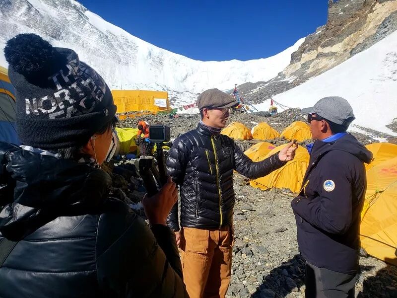 2019年5月22日上午,西藏分社记者王沁鸥(左)、孙非(中)在海拔6500米营地进行直播报道。(罗布 摄)