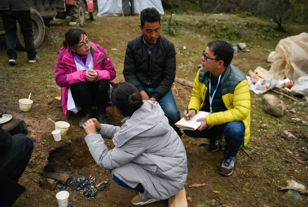 2018年10月20日,西藏分社记者薛文献(右二)、张京品(右三)、旦增尼玛曲珠(右一)在西藏林芝市墨脱县墨脱镇玛迪村临时救灾安置点帐篷内采访受灾群众。(新华社记者 刘东君 摄)