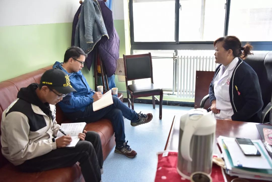 2019年5月22日,西藏分社记者张京品(左二)、格桑边觉(左一)在中国海拔最高的县级人民医院——双湖县人民医院采访。(新华社记者 周锦帅 摄)