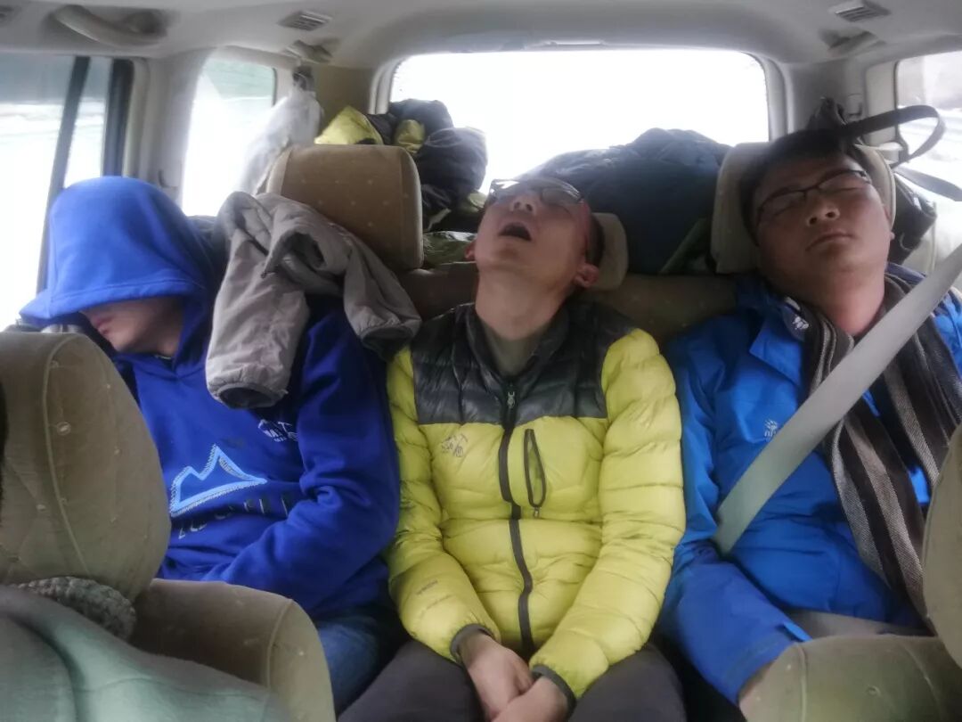2018年11月17日,完成金沙江堰塞湖抢险报道后,回拉萨途中,报道组成员疲惫地在车上睡着了。(新华社记者 坚赞 摄)
