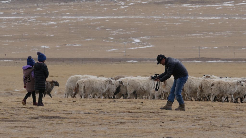 2017年2月20日,西藏分社记者坚赞在冰封的纳木错湖边拍摄牧民冬日生活。(新华社记者 洛登 摄)