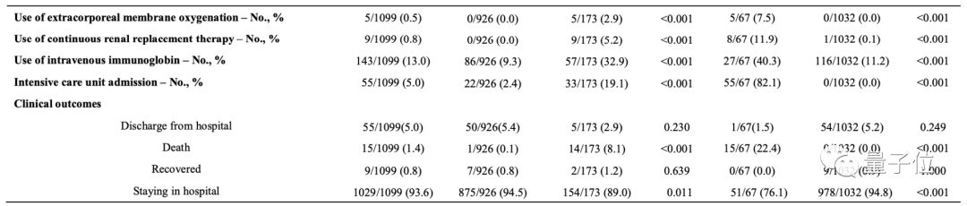 5例重症患者采用体外膜氧合,非重症患者未采用体外膜氧合(P<0.001)。< p="">