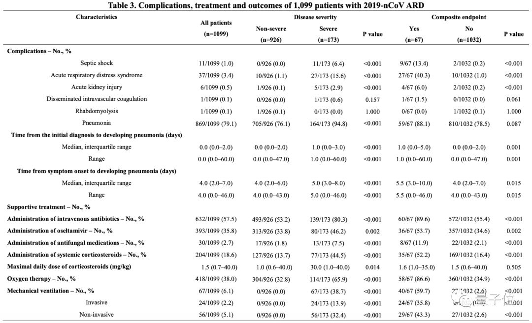 住院期间最常见的并发症是肺炎(79.1%),其次是ARDS(3.37%)和休克(1.00%)。严重病例的并发症发生率明显高于非严重病例(94.8% vs. 72.2%,P<0.001),如下表所示。< p="">