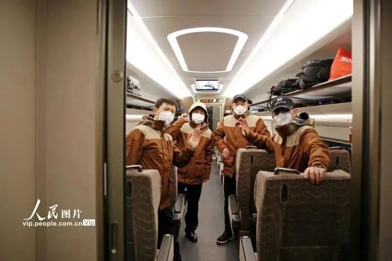 2020年2月20日,中国摄影家协会主席李舸、《中国摄影》报副总编辑柴选、中国文联摄影艺术中心网络信息处编辑陈黎明、中国文联摄影艺术中心原主任刘宇(从左至右)踏上开往武汉的高铁。张双双 摄