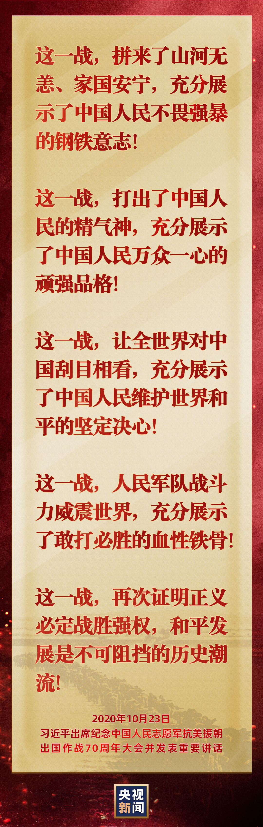 纪念中国人民志愿军抗美援朝出国作战70周年大会今天上午在北京人民大会堂隆重举行,习近平发表重要讲话。