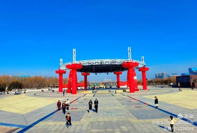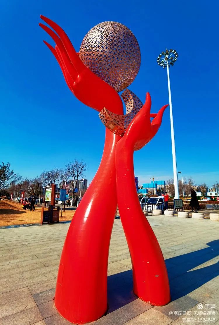 来到39米高的点赞塔脚下,就到了开放的商丘好人主题公园北门。镌刻着“商丘好人主题公园”字样的立方体建筑,如巨幅红旗招展。迎面矗立着红红的“商丘好人”立体LOGO,心与心相连,手与手相牵。公园广场中心圆形天幕舞台,6根红色立柱擎起、东西两侧拱门如红丝带飘扬,红红火火,给人温暖的力量。