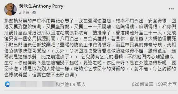 他还表示:“自己在台湾都住在饭店里不出门,回香港反倒还要坐飞机、隔离21天,可以说是麻烦又危险,你们所说什么台湾危险所以回港毛关系都没有!”