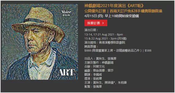 根据他自己的说法,这次回港是为了8月开始在神戏剧场开演的舞台剧《ART呃》做准备。根据官网,这次舞台剧演出从8月13日开始,共9场,票价分为588港币和888港币两个档位,目前来看9场的门票都已售罄。