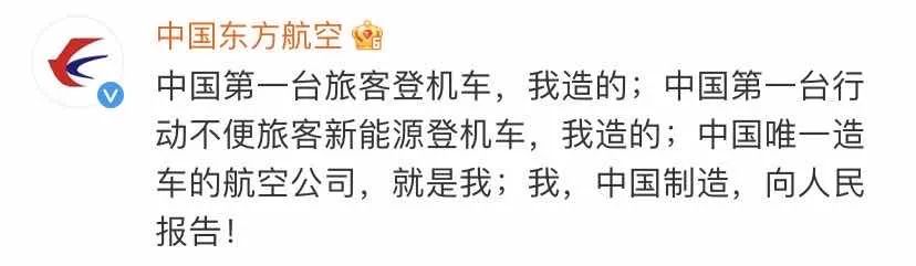 @中国东方航空:中国第一台旅客登机车,我造的;中国第一台行动不便旅客新能源登机车,我造的;中国唯一造车的航空公司,就是我;我,中国制造,向人民报告!