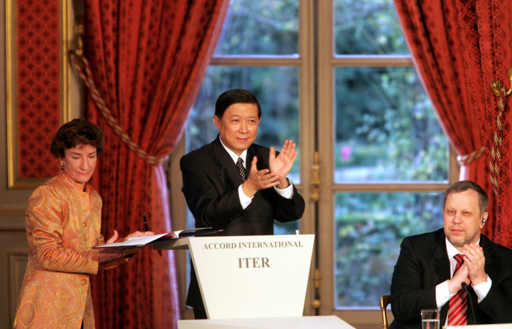 ↑这是2006年11月21日,时任中国科技部部长徐冠华(中)在法国总统府爱丽舍宫出席仪式,代表中国政府在ITER计划联合实施协定及相关文件上签字。