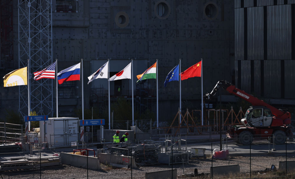 ↑在位于法国圣保罗-莱迪朗斯的国际热核聚变实验反应堆(ITER)的建造厂房外,中国、欧盟、印度、日本、韩国、俄罗斯、美国七个参与方的旗帜和ITER组织的旗帜迎风飘扬。