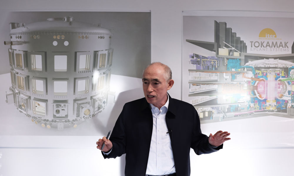 ↑2023年11月24日,在法国圣保罗-莱迪朗斯,中法联合体ITER项目总指挥、中核欧洲公司总裁邰江介绍ITER托卡马克装置的重点系统和设备及其安装的最新进展。