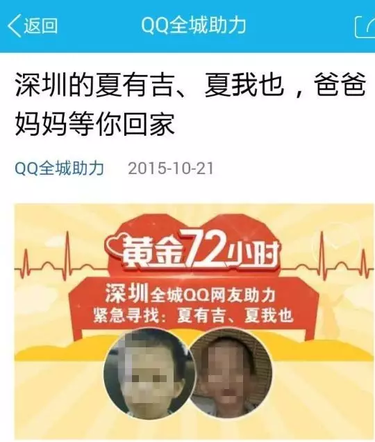 QQ全城助力公益寻人平台,通过向失踪儿童所在城市数以百万计的QQ用户推送走失儿童信息、并提供警方联络电话的方式,自2014年10月上线以来已经在全国找回16名失踪儿童。