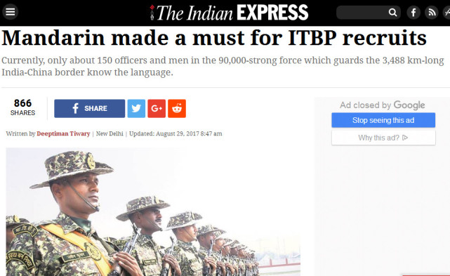 印度《印度快报》8月29日消息,洞朗对峙结束后,印度边防部队做了一个决定:新入伍人员必须强制学习中文。
