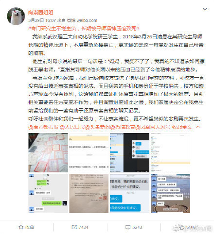 武汉一研究生不堪导师压迫致死 曾被逼喊爸爸