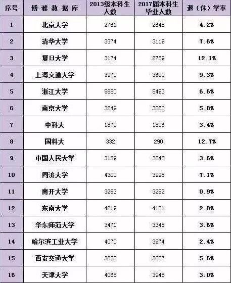 根据博雅数据库整理的名校2017年休学率数据,退学率最高的是国科大(12.7%)、复旦大学(12.1%),清华为7.6%,北大为4.2%,中科大仅为3.4%,退学率低的如东南大学、哈工大、南开,均低于3%,其中南开仅0.9%。