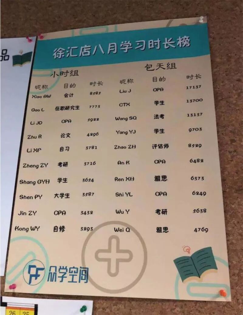 在自习室外的墙上,挂着一张学习时长排行榜,从这张表上可以看到,来这里的有不少考研学生,还有很多备战CPA、CFA及各种执业证书的职场人。此外,还有一些人是纯粹来自修,处理工作上的事情。