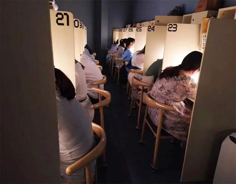 一间“小黑屋”里有30多个座位,每个座位会设一个格子间,格子间的周边相当昏暗,禁交谈禁饮食禁键盘鼠标声……