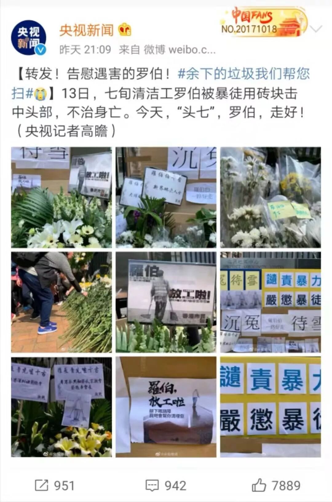 70岁清洁工罗伯(罗长清)被暴徒用砖块击中头部,不治身亡。昨天是他的”头七“。