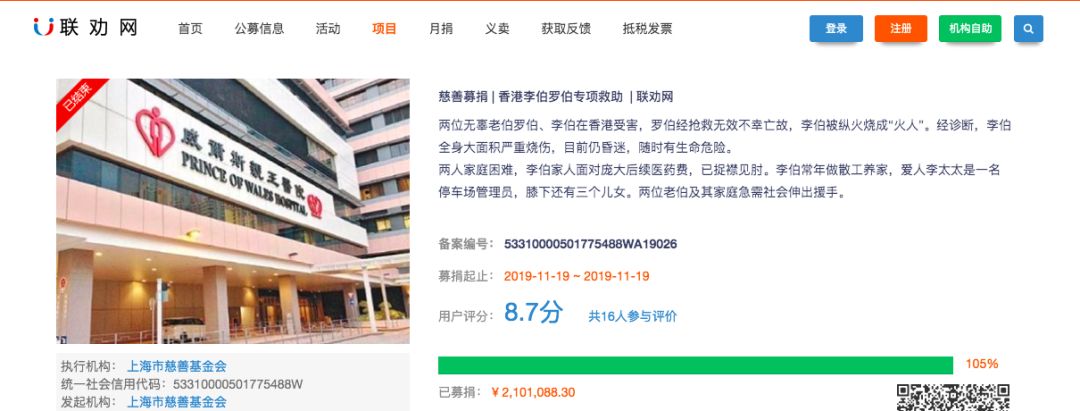 据主办方介绍,“香港李伯罗伯专项救助基金”项目筹款已达到两百万元人民币,超过3万余名爱心人士捐款,仅仅8小时就已达成计划筹款目标。