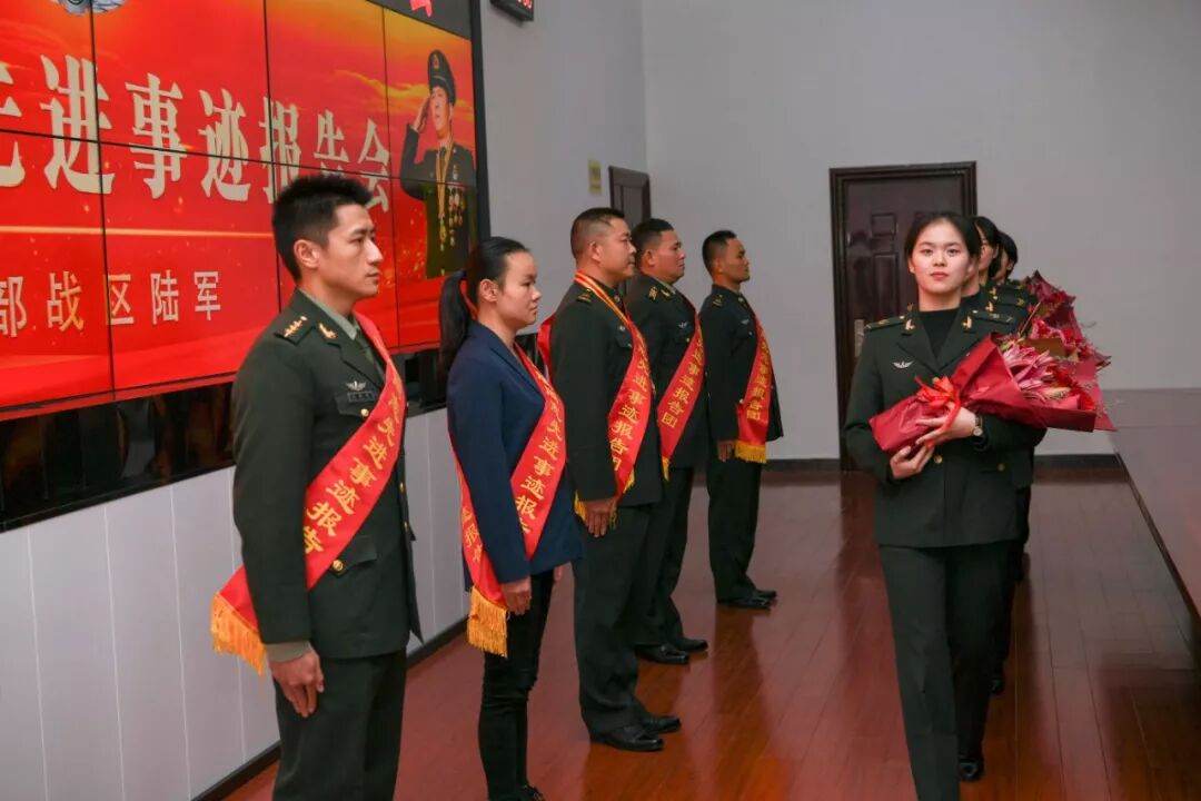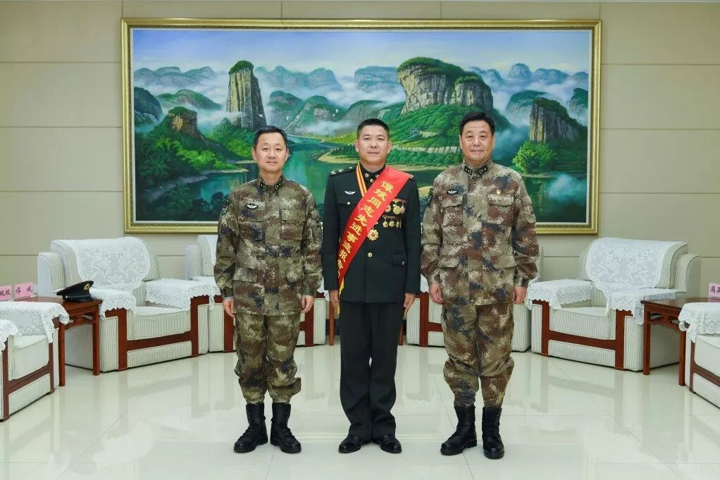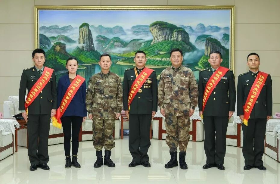 “来,谭斌,你站中间。”报告会开始前,战区陆军司令员徐起零、政委张红兵会见谭斌同志先进事迹报告团成员。