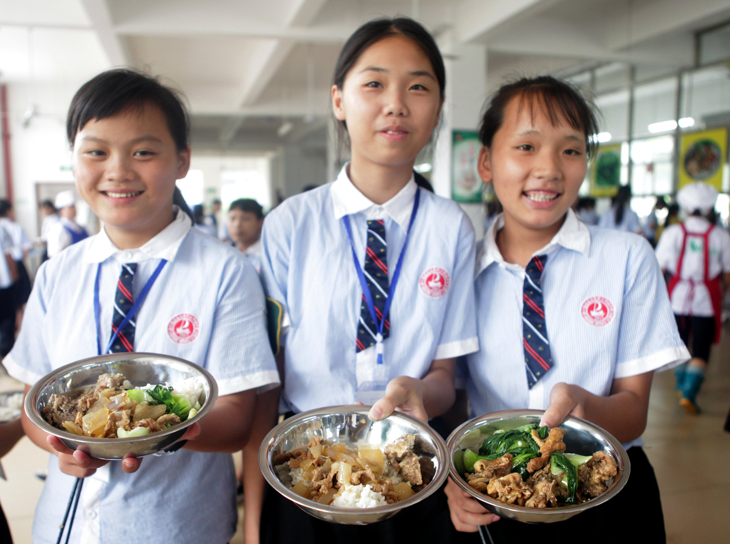 全国实农村义务教育学生营养改善计划,广西柳州市融水苗族自治县丹江中学学生展示自己盛的饭菜(IC Photo 图)